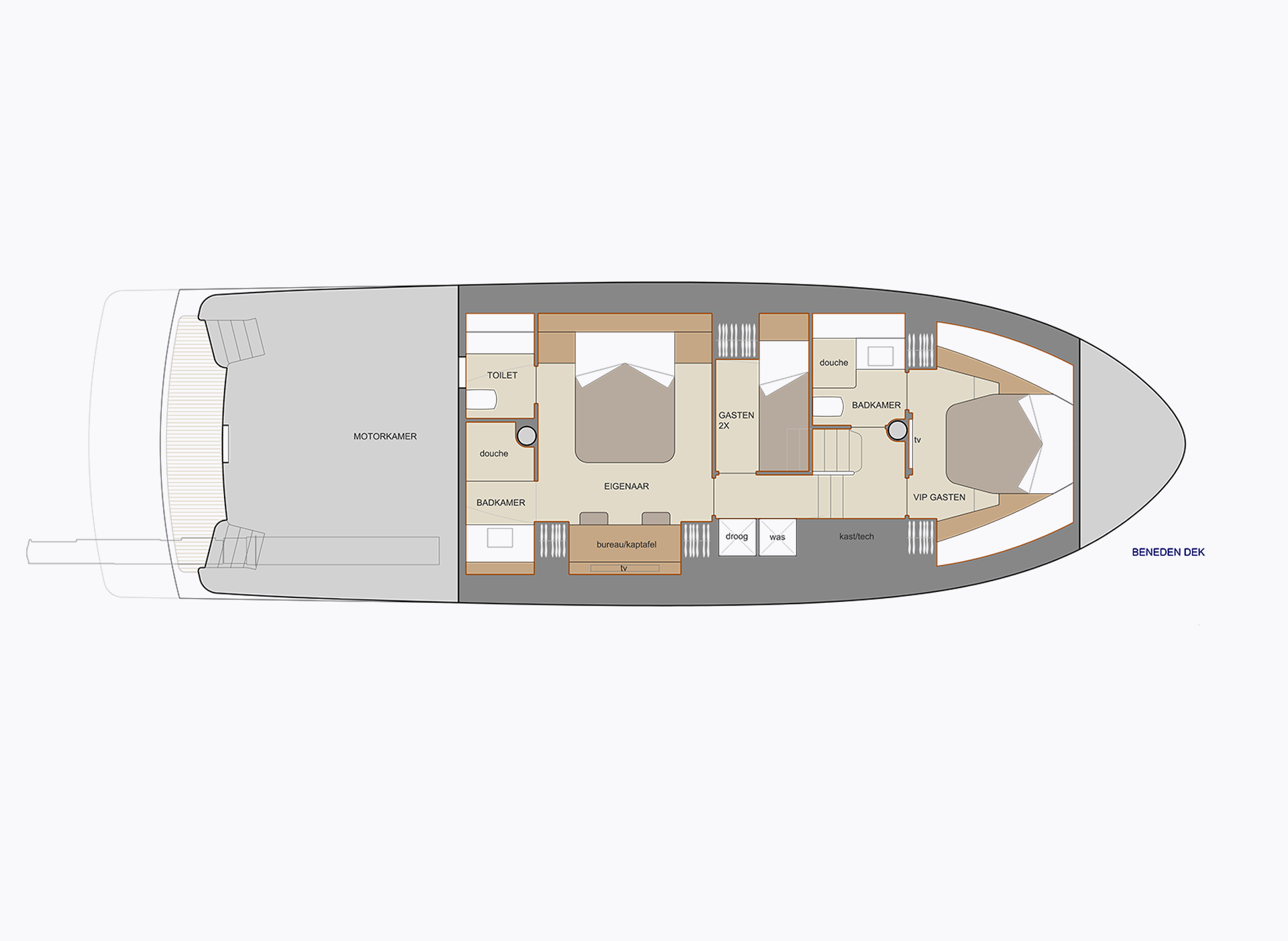 De Elite is een stalen motorjacht met een rondspant. Dat is een scheepsromp die bekend staat om zijn uitstekende vaareigenschappen en verhoogde comfort op het water. Dankzij de vloeiende lijnen en natuurlijke waterverplaatsing ervaart u minder weerstand en een aangenaam vaargedrag — ook bij langere tochten en wisselende omstandigheden. Omdat een rondspant minder weerstand heeft, gaat hij erg zuinig met brandstof om. Het resultaat is een stille, stabiele en ontspannen vaarbeleving die volledig past bij de hoogwaardige signatuur van Van den Hoven.