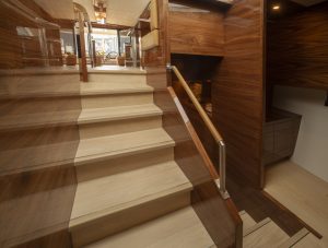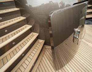 Aan het einde van iedere gangboord is een prachtige trap geplaatst die toegang biedt naar het ruime zwemplateau en de deur naar de machinekamer.
