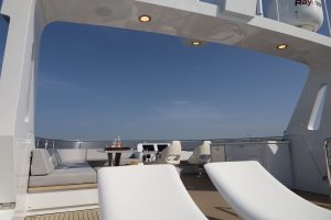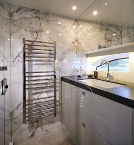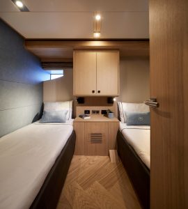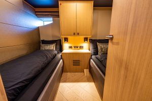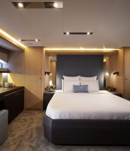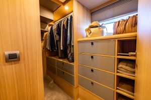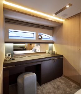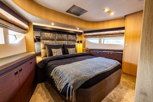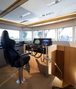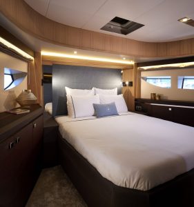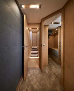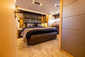 Ook het open uitzicht is met de volle 360 graden meer dan uitstekend. Luxe alom dus. Op een vergelijkbare wijze worden benedendeks glazen wanden en deuren gebruikt in de badkamers om aaneengesloten ruimtes te creëren. Deze uitvoering van de Voyager heeft een ruime master bedroom met badkamer, een apart eigen toilet en een ruime walk-in closet.