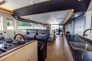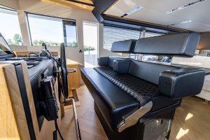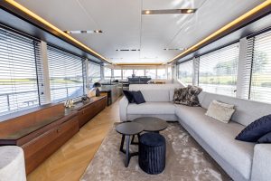Het grote open hoofddek is volledig gelijkvloers en herbergt de salon, de eetkamer, de keuken en de stuurstand, die net als de keuken van alle state of the art apparatuur voorzien is. Het gebruik van glas als onderdeel van de opbouw vult de lichte en luchtige ambiance van de Voyager 61 verder aan.